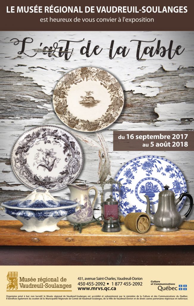 L’exposition L’art de la table est un magnifique prétexte pour présenter une sélection d’objets utilisés dans les cuisines et les salles à dîner québécoises aux 19e et 20e siècles. Vous y découvrirez en majeure partie des artefacts provenant des collections du Musée régional de Vaudreuil-Soulanges qui vous rappelleront des souvenirs des repas et des tablées d’antan. L’ouverture sur le monde se reflète sur nos tables au Québec depuis les origines du pays, aussi une section de l’exposition présentera quelques artefacts propres à six communautés culturelles de nouveaux arrivants québécois.